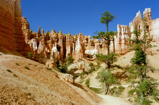 Im Hotel gab es Continentalfrühstück ohne geforderten Aufpreis. Nun befuhren wir die Straßen Utah´s in Richtung Bryce Canyon. Alles war nett anzusehen, die Landschaft begrünt, umrahmt von Bergen, ansehnliche Behausungen der Mormonen, bewirtschaftete Felder. Nur die Autowracks auf und neben den Grundstücken gehören zum weiterhin gewohnten Bild, egal wer die Bewohner sind. Eingekehrt sind wir in einem Cafe in Hatch, direkt an der Landstraße 89. Sehr schmackhaft - acht Broilerteile und drei Teller, Cappuchino, Latte und Ice-Creme-Shake und nett. Kolibries haben die Tränke aufgesucht, niedlich. Gegenüber war ein Antiquitäten-Kramladen, so viel Kitsch auf einem Haufen. Nahe unseres Hotels war Ruby´s Inn, mit Reitstall, Shops im Stile eines Westernfilmes und auf dem Platz davor stand der Trabi von Rolf aus Halle, mit MD-Kennzeichen. Ein Gruß aus der Heimat. Mit dem Shuttle-Bus sind wir zu einem Aussichtspunkt im Bryce Canyon gefahren und haben den Canyon zu Fuß durchlaufen. Gelaufen und gelaufen. Es waren herrliche An- und Ausblicke, echt wunderschön. Wir sind sehr viel gelaufen, da wir durch den Wirrwarr der Schilder und dem männlichen Orientierungssinn uns im Canyon „verfingen“. Um 19 Uhr Utah-Zeit war Rodeo-Zeit. Einfach herrlich. Begrüßung mit der Nationalhymne. Alles singt und hält die Hand ans geschwollene Herz. Pferderodeo (ich denke keiner hat das in der geforderten Zeit geschafft), Kinder auf Schafen, Rodeo auf Stieren. Die Stiere wurden im hinteren Teil mit Seil und Glocken behängt und festgebunden, daraufhin waren sie automatisch unruhig. Ein Cowboy blieb liegen, er war sehr unglücklich auf der Erde aufgeschlagen. Ging aber gut aus. Schnelligkeitsreiten um Tonnen, Schnelligkeitsreiten mit Lassofang von jungen Stieren - einer an den Hörnern der andere Reiter an den hinteren Fesseln. Es wurde ernsthaft kühl und unsere am Tag aufgeheizten Körper wehrten sich zitternd. Technik hat versagt, so dass ich Katrin nicht telefonisch erreichen konnte.