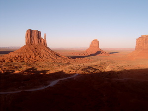 Betrübt haben wir drei unsere Reise fortgesetzt. Aber Katrin möchte, dass wir weiterhin einen schönen Urlaub erleben. Wir wollen ihr ja über unsere Erlebnisse berichten und müssen deshalb unseren Trübsal verblasen. Nach ca. 2 Stunden Fahrt sind wir im Hotel angekommen. Stadt, Gegend und Hotel sind in freundlicher Indianerhand. Von Kayenta aus sind wir in Richtung Norden zum Monnument Valley und haben kurzfristig den Bundesstaat Utah befahren. Die gewaltigen Steinberge schauten uns von Weitem entgegen. Mit unserem Auto haben wir das Gebiet befahren. Unbefestigte rotstaubige Straße neben gigantischen Steingebilden. Mit Phantasie konnten wir einen Elefanten erblicken. Manche Steine lassen eingemeiselte Figuren erahmen, Torbögen, Statuen. Eine Schildkröte, die auf dem Rücken liegt und herzhaft lacht (hier fehlen nur die strampelden Füße). Indianerfrauen hatten sehr schönen Schmuck verkauft. Türkiese und andere glückbringende Dinge. Der rote Staub drang durch jeden noch so kleinen Spalt und unser Auto war entsprechend gekennzeichnet. Nach einem sehr kühlen Männerpoolbad haben wir die indianische Küche probiert. Nur Andreas hat mit „Alfredo“ ein winziges indianisches Element im Essen. Das gesamte Indianergebiet nimmt nicht an der Umstellung zur Sommerzeit teil. Wir haben uns gewundert, zum Abendessen die Letzten gewesen zu sein. Morgens haben wir uns darauf eingerichtet. Das Frühstück war gut. Katrin haben wir am Abend noch telefonisch erreicht. Ihre Maschine in Phönix ist planmäßig gegen 22 Uhr gestartet. Mittlerweile wurde sie wieder kontrolliert. Die sms von Katrin konnten wir nicht empfangen. Das gesamte Reservat ermöglicht keinerlei Empfang.