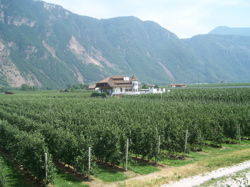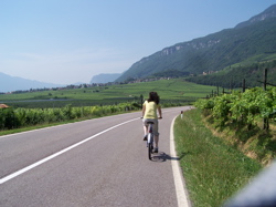 Frühstück, Baden ... mit dem Rad nach Tramin. Von hier stammt der auch weltbekannte Traminer – ein Weißwein. Enge Gassen, typische Fassaden, ein Marktplatz mit Brunnen und Kirche ... voller Hitze und Arbeitern, die schattige Plätze für ihre Mittagspause suchten. Im Tal waren jenseits der Etsch weitere kleine Städte ... Ora ... zu sehen, nicht weit entfernt ... doch unter der Mittagssonne nicht gerade idyllisch und einfach zu erreichen. Wir haben den Radweg entlang der Etsch genutzt und wurden am 2. Ort geschickt vorbeigeführt. Gut nun, wir sind umgekehrt und haben uns entschlossen, den weiteren Weg zurück am Fluss zu nehmen. Doch die Fahrt nahm kein Ende, wir passierten Bozen und kraxelten auf dem Rad in praller Sonne die Berge hinauf. Das Dumme, wir wollten kurz mal mit dem Rad nach Tramin ... und hatten nichts an Proviant mit. Ich durfte schluckweise vom heißen Mineralwasser aus der Radfahrtrinkflasche trinken. Am höchsten Punkt in Eppan haben wir endlich einen Supermarkt gefunden, aufgetankt und sind abseits der Straße nach Kalterer Dorf gedüst. Zwischen den Wäldern und Weinreben lockten schattige Plätze vor einem Restaurant ... Cola zum Kräftigen und wahrscheinlich ist und hier die Radpumpe „abhanden“ gekommen. Die letzten Kilometer bergab waren trotz Gegenwind gut zu bewältigen.