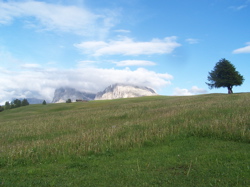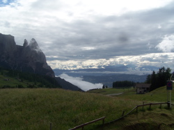... an unserem Abreisetag. Das Zelt haben wir dennoch einigermaßen trocken zusammengelegt und sind weiter in Richtung Dolomiten. Über Bozen und da haben wir kurz Halt gemacht. Wir brauchten eine neue Luftpumpe und hatten so Gelegenheit, die Altstadt zu besichtigen. Gut erhalten, kleine Gassen, kleine Läden, Markt mit Obst und Gemüse, viele Menschen ... Haben zum ersten Mal Pizza in Italia gegessen – groß und gut. Wieder weiter in Richtung Kastelruth, in Völs zur Seis, Seiser Alm und dort zum Zeltplatz. Terrassen, viele Sonnenplätze. Eine traumhafte sanitäre Einrichtung unter der Erde. Da hinkt manches Luxushotel hinterher. Den Ort Seis haben wir besichtigt und sind am späten Nachmittag auf die Alm gefahren, um bis zur nächsten Hütte, die ein Hotel war, zu wandern.
