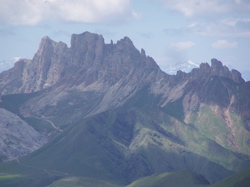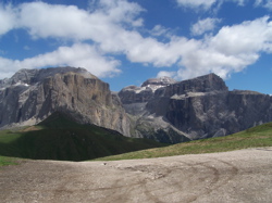 Besichtigung der Rundtour mit Auto über St. Ulrich, St. Christina und Wolkenstein – hinauf zum Sella Joch. Von dort aus sind wir wieder einmal wie die Friseure gewandert – ich bis zu einer Hütte mit Gaststätte und weiter Sicht (die durch den Regenguss weitaus besser als die Tage davor war) – mein Bär bis zur Spitze des nächsten Berges, zur Rundumsicht. Die Rückfahrt sollte am Rosengarten vorbeiführen. Doch da stand uns in den engen Straßen ein LKW im Weg. Quer über der Straße zwischen Abgrund und Fels, einer der Reifen war defekt. So drehten wir auf der Stelle ... holten in Seis leckeren Schinken und Käse und ... Deutschland hat gegen Argentinien gewonnen, ein spannender Tagesausklang. Ach ja, Kartenspiele im Dämmerlicht, drei Gewinne bis zum Schlafengehen.