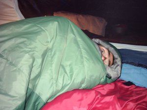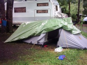 Doch schon in der Nacht sollten wir unsere Überraschung erleben. Es fing so langsam an sich einzuregnen- jedoch wollte der Regen am Tage darauf nicht aufhören und so gießte und gießte es den lieben langen Tag und die liebe lange Nacht. Das nahm ich zum Anlass, mal mein erworbenes Zelterwissen anzuwenden und, wie es mein Pa mir schon beibrachte,das Zelt mit einem Graben zu versehen, um weiteres Unterwässern zu unterdrücken. Ich falle nicht weit vom Stamm...