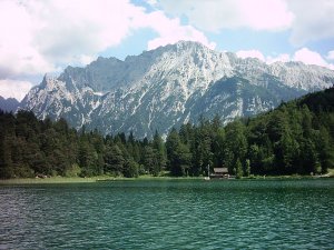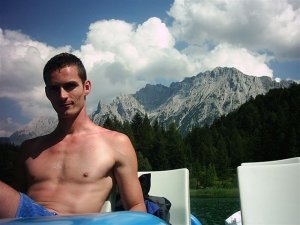 Am nächsten Tag war ein Spaziergang zum Lautersee geplant- der lag etwas oberhalb von Garmisch am Fuße das Wettersteingebirges. Am Nachmittag dort angekommen, liehen wir uns ein Tretboot aus um diesen wunderschön klaren oligotrophen See näher kennenzulernen. Jedoch war der See sehr klein, somit blieb ein wenig mehr Privatsphäre aus, was mich nicht davon abhielt nackt baden zu gehen..Leider rief der Bus in Garmisch und so mussten wir auch schon wieder den See verlassen und machten uns auf Richtung Stadt. Da der Bus 3Euro80 kostete und wir zu unserem Pech nur 3Euro79 und einen 100Euro-Schein(unser Erster!!) hatten machte ich mich auf die verzweifelte Suche nach einem Centstück- man findet ja eigentlich immer irgend einen Mist auf der Strasse und ab und zu auch mal ein oder zwei Cent- aber wenn man es mal braucht...naja. Da wir laut Karins Auskunft( sie durchforstete derweil den Busfahrplan..) noch ca. eine Stunde Zeit hatten, lockte uns ein in der Nähe befindliches kleines Café mit Volkstümlicher Musik zu einem gemütlichen Kaffee, um die Zeit totzuschlagen. Selbstgemachte Windbeutel in Kaninchengröße mit Erdbeeren und Vanilleeis, dazu eine Eisscchokolade lockten mich in ihren Bann.