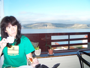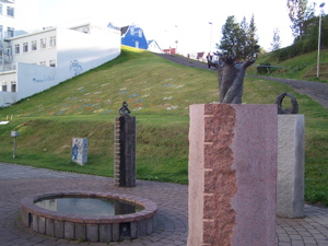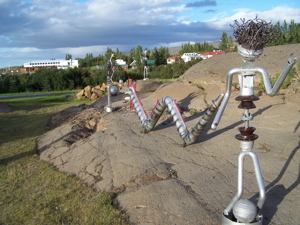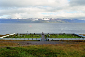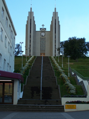 Akureyri liegt am längsten Fjord des Landes und ist damit gut vor grausigem Wetter u.a. geschützt, so dass die Stadt von richtigen Wäldern umgeben und mit Blumen und Sträuchern verziert ist, wie kein Ort bis dahin. Nachdem wir alle Sehenswürdigkeiten gefunden (wie Kirche, Holzhaus, Botanischen Garten .... Altstadt) und leckere euroschwere Torte vernascht haben, „verdienten“ wir uns ein Abendbrot. Das Gasthaus, in dem wir untergebracht waren, lag wenige Autominuten über der Stadt – dort geht es auch zum Skigebiet und da lag bereits oder noch stellenweise Schnee. Das Häuschen war niedlich und nett eingerichtet, mit Sicht auf die Stadt. Die Nacht war nicht leise. Polarlicht flackerte am Nachthimmel. Das Frühstück war gut.