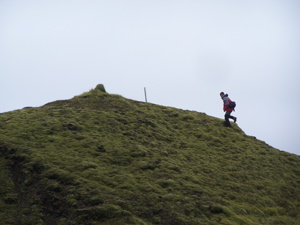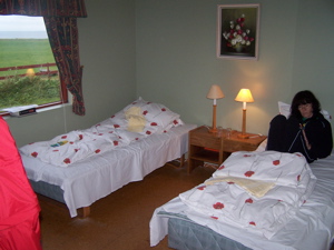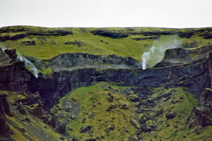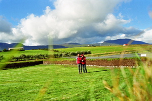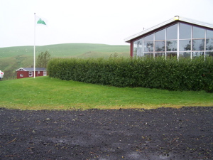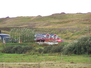 Nach weiteren 6 km haben wir unser Quartier erreicht. Ein Bauernhaus mit Bungalows auf einem großen Grundstück. Wir übernachteten in dem Bungalow mit Küchentrakt, Tisch, zwei Stühlen, Dusche ... Doppelstock- und Bett. Leider konnten wir wegen der überaus nassen Witterung die reizvolle Gegend nicht zu Fuß erkunden. Um uns herum befindet sich ein Lavafeld aus dem 18. Jahrhundert, welches mit Moos bewachsen ist. Die Gegend leuchtet deshalb in Grüntönen. Die Formen erinnern u.a. an „Land-Busen“, die aus der Erde ragen. Das Erdreich zwischendurch ist eingebrochen. Von den Hängen rauschen unzählige Wasserfälle. Am Abend haben wir uns selbst versorgt und mit „gefundenen“ Karten Maumau gespielt.