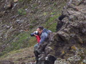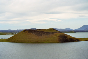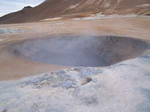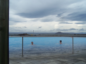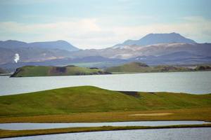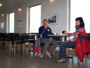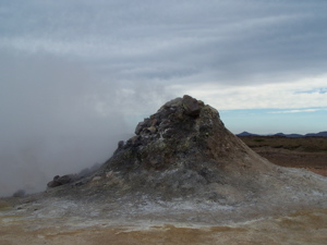 Der Wind hat zugenommen und lässt aufrechtes Gehen kaum zu. Der Godafoss wird zusätzlich aufgewirbelt. Gewaltig. Einfach über Vulkankrater wandern? Ja, hier am Muvatn ist das möglich. Wir bestaunen Pseudokrater, probehalber, bevor wir auf einen echten Vulkan aufsteigen. Nur wenig weiter dampft es aus jeder Ritze. Lavagestein, schwarze Erde und in dieser Öde eine Lagune, die himmelblau leuchtet. Wir nehmen für 1.100 IK ein Bad. Das Wasser ist sehr schwefelhaltig und an einigen Stellen der Lagune schießt 100 Grad C heißes Wasser ein. Warnschilder sollen Verbrennungen verhindern. Zwischendurch erhöhen wir unsere Körpertemperatur in der Dampfsauna. Der Wind pfeift über unsere Köpfe und lässt uns stellenweise doch die Kälte spüren. Wir haben an diesem Tag weitere Ziele und steuern als Nächstes blubbernde Erdtöpfe an. Orange, braun, beige, weiß, graue bewegliche Erdmasse, in einem dunklen Hexenkessel, kleine Vulkanberge die lautstark zischen und Schwefeldampf ausstoßen. Wir haben doch nicht immer festen Boden unter den Füßen. Die Suche nach dem Spalt zwischen den Kontinentalplatten verlief nach einigen Fehlgriffen erfolgreich. Mächtig, aus einigen Abschnitten dampft es. Der Spalt ist sehr tief. Wir standen auch auf der amerikanischen Kontinentalplatte und waren Katrin näher gekommen und sind auf die europäische Platte gewechselt und waren wieder Andreas näher ... Am Abzweig der Ringstraße 1 um den Muvatn liegt die Gemeinde Reykiahlid. Hier sitzen wir gerade in einem schönen Cafe und genießen ... Einen Ringwallvulkan haben wir bestiegen und konnten vom Rand aus in die Tiefe blicken. Von da aus konnten wir den eigentlichen Schlot sehen. Danach und weil es langsam dämmrig wurde, haben wir ein Geisterlabyrinth besichtigt. Bizarre Gesteinsfiguren, Monster aus Lava, die nach dem Ausbruch noch einmal aus dem Wasser herausgedrückt wurden. Mit der Fahrt um den Muvatn-See endete unsere heutige Expedition. Auf einem Bauernhof an einem Hang, etwas Abseits der Straße stand unser Hotel. Größer und besser, als wir erwartet hatten. Das Zimmer mit Dusche und schöner Aussicht. Auf mehreren Etagen konnten sich die Gäste in bequemen Sitzgelegenheiten aalen, einer großen Bibliothek bedienen, Kaffee und Tee trinken und im Internet surfen. Der Tag war anstrengend und hat uns hungrig gemacht. Wir sind einfach dem Geruch und Geräusch nach ... ja und dann haben wir ein Dinnerbuffet entdeckt, wurden bestimmt und freundlich an einen Tisch verwiesen. Wir ließen uns die Köstlichkeiten schmecken, ohne den Preis zu kennen. Fisch, Fleisch, Suppe, Auflauf, Kartoffeln, Reis, alle Variationen an Gemüse, Salat, Pasteten ... Torte, Sahne, Kaffee ... wir waren dick satt. Am nächsten Morgen verwöhnten wir uns am Frühstückbuffet und ... bekamen die Rechnung präsentiert! Wow.