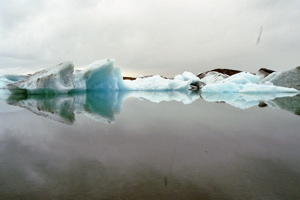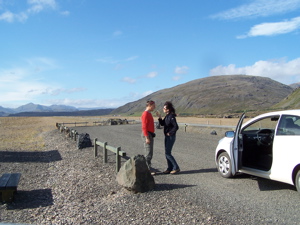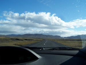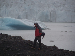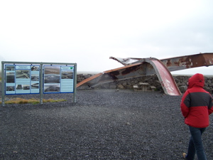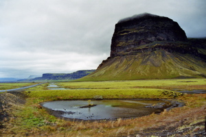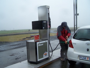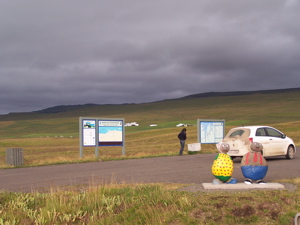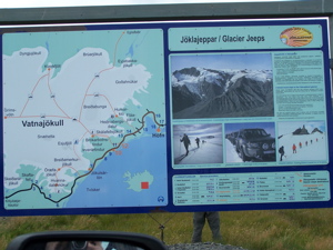 Weniger gut das heutige Wetter, 8 Grad C, Sturm und Regen scheinen nur noch heftiger zu werden. Nichts war zu sehen. Die Gletscherlagune war wolkenverhangen abgetaucht. Gut, dass wir gestern Abend bereits hier waren. In den wenigen Stunden zwischen gestern Abend und heute Morgen hat sich einiges verändert: Eisberge von gestern trieben bereits zerbarst ins Meer hinaus, einige tanzten vom Wind getrieben im Kreis. Auch der kleinere Gletschersee gab keine bessere Sicht her. Unsere Kleidung war nass und klamm. Höhepunkt der Sturmfahrt war der Halt an der Esso-Tankstelle Fagurhdsmyri an der untersten Spitze des Vatnajökull. Nur mit gesammeltem Kraftaufwand konnten wir uns und z.B. die Autotüren halten. (leider kommt der extreme Sturm auf dem Foto nicht zur Geltung) Neben der Straße laufen wieder Gletscherzungen in unsere Richtung. Hier am Hotel Skaftafell hat Wieland den Berg bestiegen, um bis zum Rand der Gletscherzunge vorzukommen. Es gelang nicht. Der Regen ist abgezogen, allerdings bewegt sich unser Auto (ich sitze schreibend und wartend im Auto) im Sturm hin und her. Im Skaftafell-Nationalpark haben wir die Informationen durchgeforstet. Die bewegte Geschichte dieses Gletschers und die Vulkantätigkeit beeindruckt uns sehr. Das Wetter ist gerade heute unserer Bekleidung nicht angemessen und so machen wir einen Bogen um den NP. Sehr schade. Der Himmel ist fast völlig verdunkelt. Dazu kommt die schwarze Sand- und Geröllwüste zu beiden Seiten der Straße. Nur noch die gelben Leitplanken bringen Farbe ins Bild. Hier haben wir die neue Brücke überquert. Überreste der durch den Gletscherlauf verbogenen Brückenpfeiler stehen noch am Straßenrand. Ein Teil der zerstörten Straße haben wir umfahren müssen. Um ehrlich zu sein, im Moment sieht alles hier sehr gruselig aus.