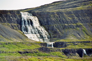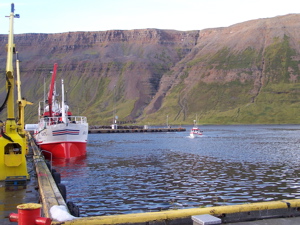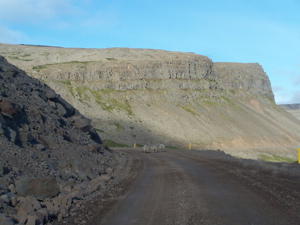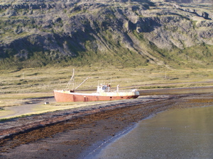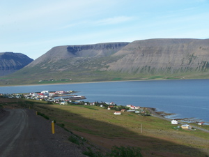 Der Weg nach Isafjördur war zu 70 % steinig und führte wieder über den Mond. Weite Sicht, blauer Himmel, Sonne, Wasserfälle, Schafe (auch auf den Straßen), Riesensteine so weit das Auge blickt. Nicht nur diese Straßen haben so genannte „Blind date“ – Stellen, da fährt man wie auf der Achterbahn, sieht nicht was dann kommt, in welche Richtung die Straße weiterführt und ob Gegenverkehr ist. War aber alles kein Problem, da Begegnungen mit Menschen zwischendurch äußerst selten waren. Die Schafe tragen ihre Wolle zurzeit offen und springen schnell über die Prärie, ihr Hinterteil sieht lustig aus, bewegt sich sehr schwungvoll hin und her. Die Wolle federt im Zeitlupentempo nach. Der größte Wasserfall der Westfjorde Dynjandi liegt direkt neben der Straße und ist sehr beeindruckend. Ein E-Werk in der Mondlandschaft, ein Bergsee über dem Werk, Rohre in denen das Wasser mit Schnelligkeit durchrast, sorgen für kostengünstige Energie auf den Westfjorden. Trotz der nicht enden wollenden Fahrt leisten wir uns einen Abstecher nach Flateyri. Der Ort liegt auf einer Landzunge zwischen den Fjorden und ist oberhalb der letzten Häuser mit einem Erdwall vor Lawinen geschützt. Das Unglück von 1995 soll sich so nicht wiederholen als eine Lawine Häuser und Menschen begrub. Direkt an dieser Stichstraße haben wir eine recht große Anlage mit Trockenfisch entdeckt. Mystisch. Kurz vor unserem Etappenziel haben wir einen Tunnel befahren. Mitten im zum Teil einspurigen Tunnel gab es einen Abzweig nach Sudurey. Hier bezogen wir eine Herberge mit einem Smilie am Haus. Schön, sauber, mit stilvollem Restaurant. Das Abendessen, es gab Fisch, war vorzüglich. Vorher haben wir gesehen, wie Fischer ihren Fang am Hafen von den Schiffen verladen haben. Ein Fischer auf einem Mini-Schiff hat mit 78 Jahren kistenweise Fisch heimgebracht. Ein Inuit hat mit Gabelstapler beim Verladen geholfen. Ihm haben wir am Abend mehrfach mit seinem Auto durch den Ort fahren sehen. Der kleine Ort lebt vom Fischfang. Fisch wird hier gleich verarbeitet. Es gibt eine Schule, Kindergarten, Schwimmbad, Sporthalle, Sparkasse, Post, Essotankstelle – hier leben wohl 300 Einwohner. Die schlechteste Nummer des heutigen Tages nun zum Schluss: Ich habe mir beim Rückweg vom Vogelfelsen meinen Fuß so stark verknickt, dass ich dachte, alles ist zu spät. Er wurde zusehens angschwollen und farbig. Ich gönne ihm nun Dolobene und humple so dahin. Schade ... Laufidee ...ade.