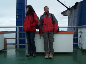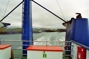 Wir waren unbegründet in Eile, denn die Fähre hat sich Zeit gelassen. Jetzt schreibe ich live, wir sind auf der Fähre, alle unter Deck – im Salon. Draußen herrscht zwar kein Sturm, aber bei ca. 8 Grad C ist es dennoch für 3 Stunden Überfahrt zu kalt. Die Maschinen blubbern, arbeiten sich ein, zz. zähle ich 16 Passagiere. Die Geräusche sind weder bestimmten Gelegenheiten zuzuordnen, noch nervenberuhigend. Die Mitfahrer, die nicht lesen, blinzeln misstrauisch in die Runde. Jedes Haus in Stykkisholmur ist andersfarbig und wir ziehen daran vorbei ... die Häuser reihen sich in Breite und Höhe aneinander ... eine Kette am Bergeshang mit Blick auf den Fjord. Der Hafen ist durch breite zum Himmel ragende abgerundete und bemooste Felsblöcke geschützt. Der Kapitän hat per Hupe die Anfahrt angekündigt. Ich spüre die Bewegung, wir drehen auf der Stelle und fahren nun auf die offene See hinaus. Hin und wieder ragen kleine Inseln wie Kleckerburgen aus dem Wasser. Diese sind vor vielen vielen Jahren durch Vulkanausbrüche entstanden. Jetzt gilt es durchhalten und nicht auf ein Vulkangestein (wie beim Eisberg?) auffahren und möglichst ohne Seasickness bags klarkommen. Der Kapitän erzählt über die Fahrt, Geschichte und den Halt in Flatey, der größten Insel hier an den Westfjorden. Die Sicht ist sehr klar. Jetzt sind wir eine Stunde unterwegs – über uns strahlt die Sonne, hier ist das beste Wetter. Wie kalt es tatsächlich ist, lässt sich unter Deck nicht ausmachen. Ich gehe nicht hoch, lasse mich nachher überraschen... Eben gab es Wale zu sehen, der Kapitän hat uns darauf aufmerksam gemacht. Gut, jetzt wurde ich für mein Stubenhockerdasein bestraft. ... Wieland hat viel Zeit auf Deck verbracht und fotografiert. Die Wale hat er auch nicht sehen können. Wir haben Land erreicht, die Westfjorde.
