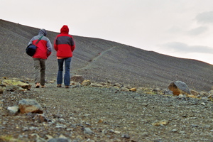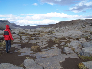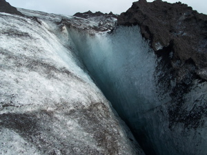 Auf der Weiterfahrt lag rechterhand wieder eine Gletscherzunge, die die Besonderheit besitzt, von heißen Quellen unterlagert zu sein. Weil der Schotterweg dort hin für Frau zu gefährlich erschien, haben wir auf einer (eigens dafür geschaffenen) „Parkfläche“ unser Auto abgestellt. In diesem Moment war der Druck auf meine Blase so stark, dass ich die Sturmrichtung ignorierte und bestraft wurde. Die beiden uns bekannten Mitreisenden parkten wegen der steinigen und löchrigen Straße neben uns und so sind wir gemeinsam zur Gletscherzunge gewandert. Jedes Ziel sieht näher aus, als es ist. Vom eigentlichen Allrad-Parkplatz aus ... und dann .... war die Gletscherzunge nah.... Sehr beeindruckend, abenteuerlich, wenn unter dem Gletscher die heißen Quellen das Eis abtauen, Spalten in die Tiefe reichen, metertief. Der beißende Schwefelgeruch, der für diesen Gletscher typisch sein soll, ist uns erst später bei der Weiterfahrt aufgefallen. Durch den starken Wind ist an diesem Tag das Gebiet auf dem Gletscher vom Gestank verschont geblieben.