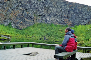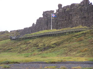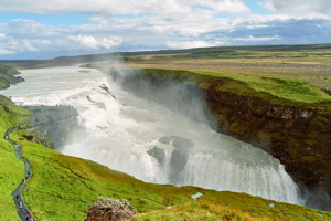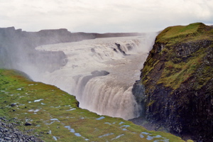 Der Gullfoss drängt sich nur wenige Kilometer später in den tiefen Canyon. In drei Etagen stürzen die Wassermassen mit gewaltiger Wucht nach unten. Ja, so einen wuchtigen Wasserfall haben wir bei der Fülle der Angebote in Island tatsächlich noch nicht entdeckt. Doch jeder Wasserfall hat seine Reize. Auch das Wetter spielt eine Rolle und bestimmt, in welcher Stimmung sich der Wasserfall dem Betrachter zeigt. Das Wetter am Gullfoss hat April gespielt. Auf dem Weg zum Nationalpark Pingvellier peitschte der Regen gegen unsere Scheiben und von unten spritze der flüssige Teil der unbefestigten Straße. Ab und zu äugte die Sonne hindurch. Auf Pingvellier wurde weltweit das erste Parlament ausgerufen und später Gesetze von Island verkündet. Geschichtlich und geologisch vielfältig. Das Auseinanderdriften der amerikanischen und europäischen Kontinentalplatten wird hier besonders deutlich. Die sicher sehr reizvolle Umgebung ist tatsächlich der schlechten Sicht und dem Regen zum Opfer gefallen.