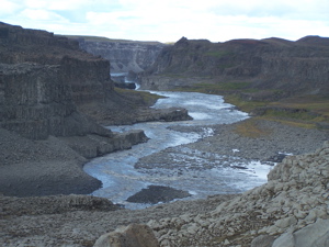 Wir fahren um die Halbinsel nach Husavik, vorbei an riesigen Lavafeldern. Wale, Lundis und Robben haben sich versteckt. Dafür haben wir eine wunderbare Sicht. Je weiter wir wieder landeinwärts kommen, um so karger wird die Landschaft. Hier befahren wir den Nationalpark Jökulsarglijufur. Wunderschön war die Asbyrgi Felsschlucht, die in Hufeisenform pure Natur umgibt. Uns überraschte an dessen Ende ein romantischer See. Vor vielen Jahren soll das ein Wasserfall, ähnlich der Niagarafälle, gewesen sein. Lava, Wüste und in der Ferne Gischt. Die Wasserfälle sind von Weiten sichtbar. Dettifoss ist der größte Wasserfall in diesem NP und rauscht mit voller Macht nach unten, so schnell, dass Wasser wieder nach oben strebt und zischt und spritzt wie in einem starken Regen. Bis zur Ringstraße sahen wir Wüste und Lava. Nun fuhren wir in Richtung Osten, nach Egilsstadir. Wüste, Wüste, Wüste ... kein Baum, kein Strauch. Auch den Schafen gefällt die trostlose Landschaft ohne Grashalm nicht, obwohl sie daran nicht unschuldig sind. So liefen hier eben Schwäne über die Straße. Nach ca. 100 km prasselte wieder ein Wasserfall nach dem anderen in die Täler. Ein paar Häuser waren in Sicht, auch Schafe, die unebenen Heiden/Gelände, die zwischendurch aufgerissen waren, grünten auf. Kurz vor einer Brücke bogen wir auf eine Nebenstraße ab, die uns zu unserem nächsten Hotel brachte. Wir fassten es nicht. Eine richtige kleine Wohnung, mit Balkon, alle Zimmer mit Holz verkleidet, Dusche, seperates Schlafzimmer. Toll. Auf der Fahrt nach Egilstadir spazierten Elche daher. Die Stadt Egilsstadir ist eine neue Stadt und die Kirche, die von Weiten wie eine Betonfabrik wirkt, steht nicht im Zentrum. Auch eine Post ist nicht einfach zu finden. Irgendwie ähnelt die Stadt einem Industriegelände. Nach kurzem Fußmarsch gelangen wir ins Grüne. Hier stehen die Einfamilienhäuser. Das hat uns besonders beeindruckt: große Tannen, Birken, Blumen, Park mit Teich, Museum, Bibliothek, Schule, großes Sportareal ...