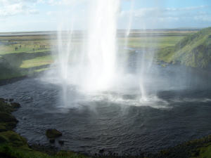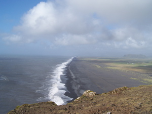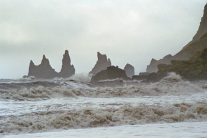 Frühstück durften wir gemeinsam mit vielen der zwischenzeitlich bekannten Mitreisenden im Wintergarten einnehmen. Die Fahrt begann zwischen den moosbewachsenen Lavafeldern und in ein sonniges Wetter. Vik ist die südlichste Stadt Islands. Am schwarzen Strand entlang zur Steilküste konnten wir dem tobenden Meer nicht immer trocken entkommen. Die Gischt spritzte meterhoch. Ja, so wurde der Meisterfotograf von einer Welle erfasst und mit nassen Füßen bestraft. Die einer Überlieferung zufolge zu Stein verwandelten Trolle ragen direkt vor der Küste aus dem Meer. Das Gemisch aus schwarzen Sand, Fels und Meer war ständig in Bewegung und zauberhaft anzusehen. Die nächste sehenswerte Attraktion wartete auf uns – der Kap Dyrholaey. Auch hier bieten die steilen hohen Küstenwände Nistmöglichkeiten für allerlei Federvieh. Das Vogelschutzgebiet ist während der Brutzeit gesperrt. Im September besteht uneingeschränkter Zutritt, allerdings sind dann u.a. die Lundis zum Winterquartier aufgebrochen. Von hier aus ist das Tor aus Stein (Brandungsloch mit Breite von zwei Schiffen ) im Meer zu sehen. Sehr stürmisch da droben, so dass Fotografieren zur Wackelkunst wird. Die riesigen Befestigungen aus verrosteten Eisen können wir uns nicht erklären. Auf einer nicht gerade für Pkw geeigneten Straße sind wir zum Leuchtturm, der sich direkt über dem Steintor befindet, gefahren. Der Sturm hier oben war kaum zu toppen und das bei solchen Sonnenschein. Das Schreien der Gischt tief unter uns hallte hinauf. Leider war auf der anderen Seite der noch aktive Vulkan Katla noch unter den Wolken. Auch unser längeres Warten und Hoffen hat sich nicht gelohnt.