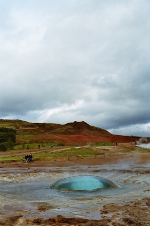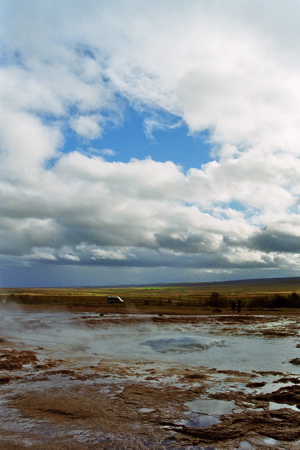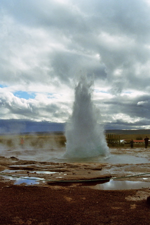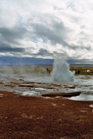Die Mitreisenden waren Frühaufsteher und so frühstückten wir allein, bevor auch wir die letzte Etappe begannen. Es soll das Highlight werden. Alle Reiseführer weisen darauf hin. Mit Richtungswechsel zum Geysir und Gullfoss bahnte sich Wetterbesserung an. Tatsächlich konnten wir einige blaue Streifen und sonnige Minuten erleben. Fasziniert hat uns der Strokkur. Dieser Geysir schießt in fast regelmäßigen Abständen (zwischen 12 und 15 Minuten) aus der Erde. Er kündigt mit Brubbeln und einer bläulichen Wasserblase an, dass er dem Druck von Unten nicht mehr standhalten kann ... und dann sprüht er über. Spaß macht es, gespannt und angespannt auf den Augenblick zu warten ... den Fotoapparat vor das Auge gepresst und den Finger auf dem Auslöser ... ich war traurig, dass mein Apparat nicht so spontan reagierte und nur Reste der Gischt zu sehen waren.