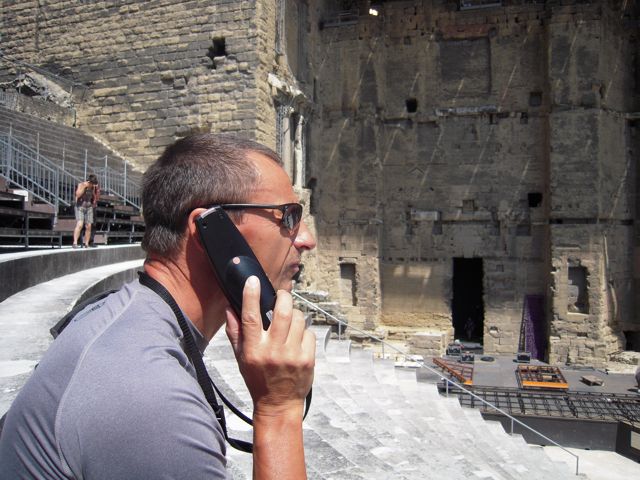 In Orange werden wir zunächst im perfekten Englisch in die Geheimnisse einer Parkuhr eingewiesen, in deren umfangreichen Tastatur das Autokennzeichen eingegeben wird. Während zur Mittagsstunde die Geschäfte schließen, die Restaurants ihr Speisen anbieten, lassen wir uns vom Steintheater, das im 1. Jahrhundert v.u.Z. erbaut wurde, in den Bann ziehen. Eine riesige Arena. Auch Opernaufführungen werden hier gezeigt. Die Arbeiten waren im vollen Gange. Hinter den oberen Steinsitzen führten Gänge in verschiedene Räume, in denen aus bedeutenden Zeitalter Aufführungen in verzauberter Machart (was mit Technik alles so möglich ist!) inszeniert wurden. Von dort aus sind wir nach Chateauneuf-du-Pape gefahren. Ein kleiner Ort mit bedeutenden Wein. Direkt für den Papst, der dort und in Avignon seinen Sitz hatte. Ein schöner Ort, der durch fast jede Haustür mit einen Hinweis zum Weinkeller führte. In einem kleinen Restaurant haben wir gut zu Mittag gegessen. Mules, Frites, Salat und diesen Wein! Herrlich und preisgünstig war´s dann doch. 20 Jahre soll der Wein lagerbar sein, den wir erworben haben. Über ein Klein-Venedig der Provence führte unser Ausflug zurück. Hier waren ein riesiges stark bemoostes Wasserrad, Flüsschen, Brücken und Restaurants. Zur Belohnung haben wir uns ein Eis gegönnt, echt Nougat, war die Krönung!