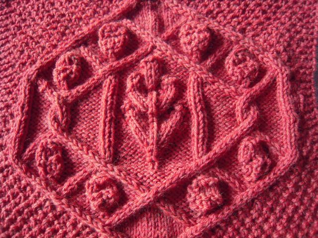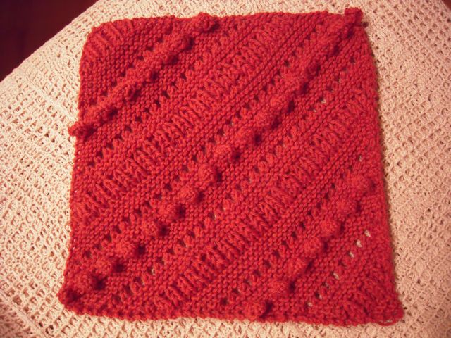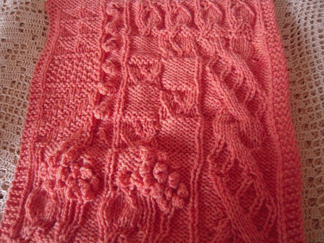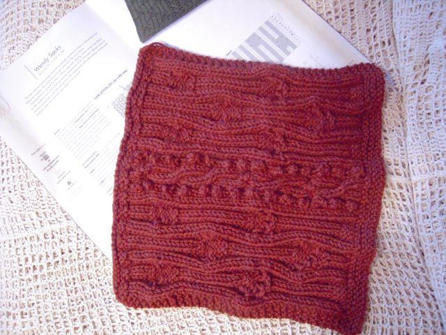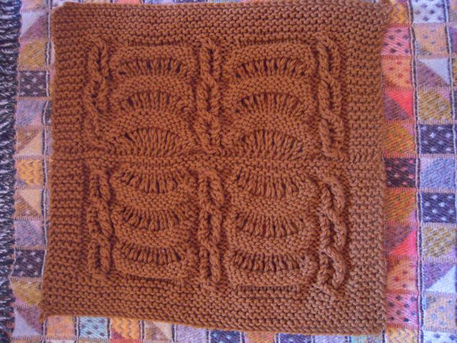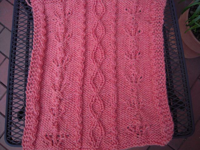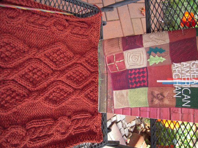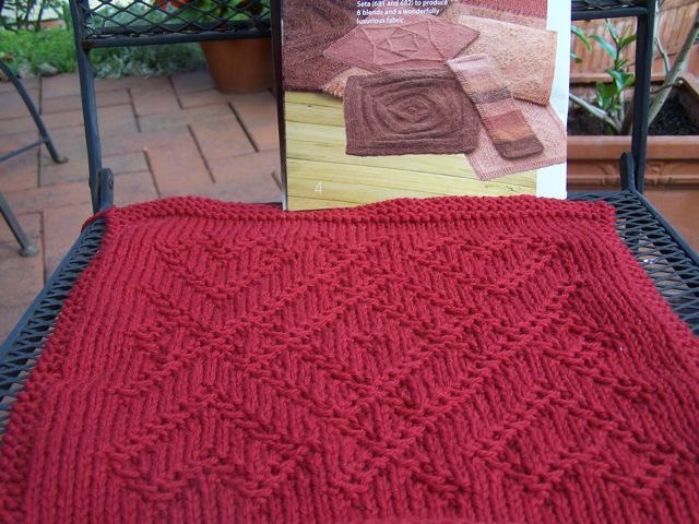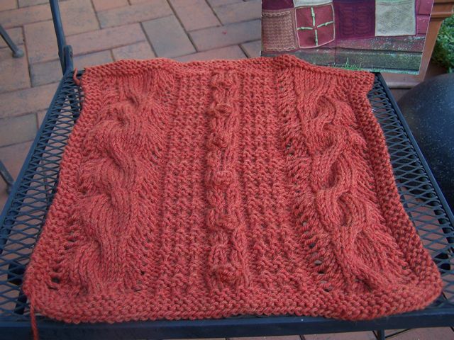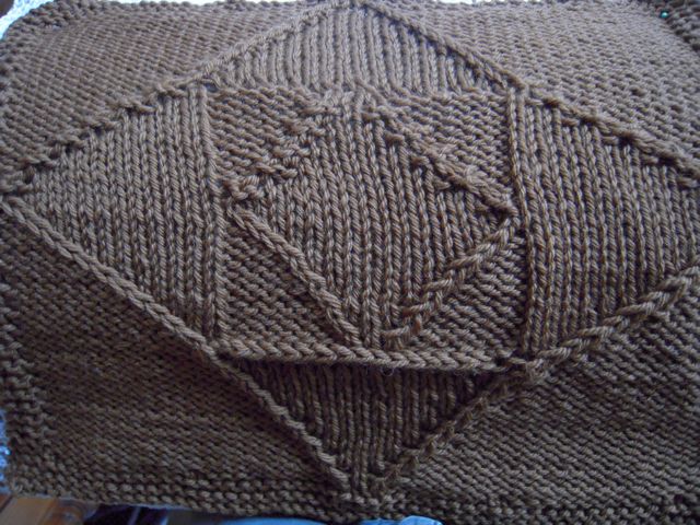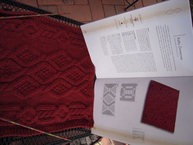 Wieder ist ein Patch von den Nadeln gesprungen. Oh. so lange habe ich gebraucht, um die englische Anleitung zu kapieren. Das erste Teil wird bis zur Mitte gefertigt. Das zweite Teil wird an den Beginn hochgestrickt. Geschafft!