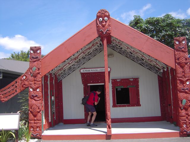 Das B&B gefunden und den Motor abgestellt, wird’s mir heiß ... meine kleine Tasche (mit den Papieren) ist weg, und ich sah sie an der Tür vom WC hängen ... Also nur keine Zeit verlieren und zurück! Zum Glück fand ich auf den ersten Metern das gute Stück unter meinen Sitz gerutscht ... Das 100 Jahre alte Haus aus Holz mit Veranda und vier Gästezimmern wurde unser nächstes Quartier. Der grooooße Gastgeberhund lag an der Pforte und nahm uns gerade mal zur Kenntnis. Hier haben wir auch Reisende aus Deutschland kennen gelernt, die über viele Wochen mehr Neuseeland bereisen ... gemeinsam haben wir den Abend bei den Maories verbracht. Das Essen garte in der Erde „eingegraben“ (war eingemauert) ... u.a. süße Kartoffeln, Lamm, Gemüse ... und schmeckte lecker. Beeindruckend (wenn auch mittlerweile kommerziell) war das Konzert. Das Kriegs- u.a. Rituale - geschrei hörte sich unheimlich und doch interessant an. Die Bedeutung der Tätowierungen wurden dabei erklärt.