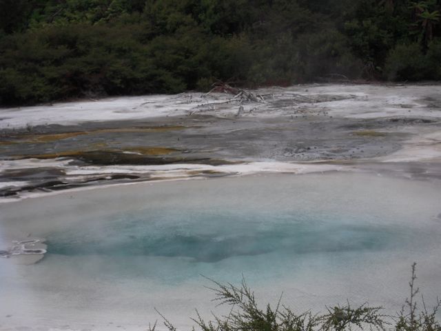 Durch eine grüne abwechslungsreiche Landschaft fahren wir nach Rotoura. Schwefelgestank und meterhohe Rauchwolken machten uns aufmerksam auf ein großes Thermalareal – TePuia. Ein historisches Dorf der Maories mit Versammlungshaus, Kiwihaus ... aber eben auch der meterhohe Geysier ‚Pohutu’, der minutenlang seine heiße Wasserladung in die Höhe spuckte, Silikatterrassen, Blubberschmand ... und das alles inmitten von viel Grün und üppiger Vegetation.