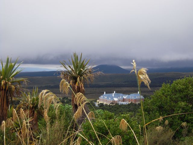 Frühstück am Bett und auf zur Suche nach dem Mt. Torangariro Nationalpark. Zunächst ewig entlang am 40 km langen See, hinein in die Berge ... das saß der Nebel fest ... rund um das Chateau. Drei Stunden Wanderschaft durch Regenwald, Farnbäume, Lavagestein ... haben uns gut getan und wir hofften auf einen Blick zum Vulkan ...