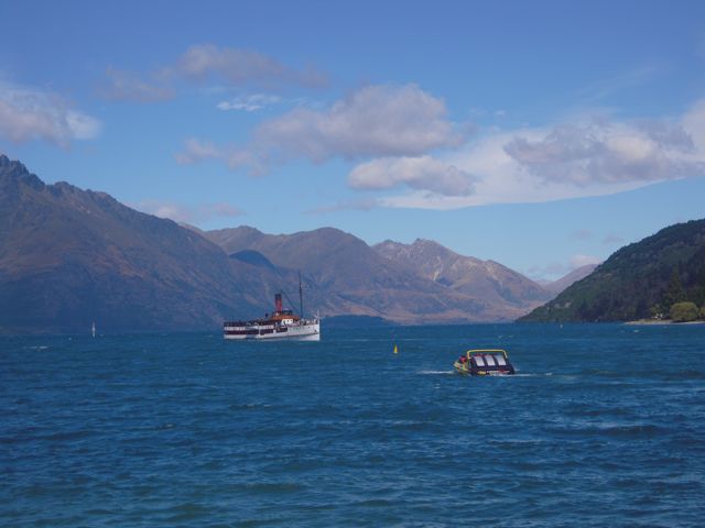 Zeitig war die Nacht zu Ende weil unser Flieger nach Queenstown um 9:30 Uhr startete. Um 10:10 Uhr hatten wir die Southern Alpes überquert, eine Meisterleistung des Piloten, der das Flugzeug fast Boden berührend zwischen den Bergen hindurch und hinab auf die Rollbahn geleitete. Queenstown ist belebt und idyllisch gelegen. Hier haben wir uns amüsiert. Musik live, Guinness, Eis, riesiges Stück Torte, Jongleure, Dampfer, Junggesellenabschied, Friedhof, Sonne pur ... Auf der Wiese haben wir gelegen ... und uns sehr wohl gefühlt. Durch das UVA-Shirt bin ich angesprochen worden und ... die Miss hatte auch eine Tochter dort. Sie lebt in Virginia und liebt es.