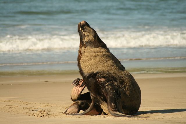 Wenige Minuten von der Farm entfernt rauschte der Wasserfall, den wir besichtigten. Die Fahrt führte uns direkt an der Küste entlang und wir wagten einige Abstecher, um direkt die Strände zu besuchen. Wir sind zwischen den Robben und Seelöwen im goldenen Sand gelaufen und die See, der Himmel und die Berge um uns machten uns glücklich. Die letzten Meter zurück mussten wir durchs Wasser laufen, da dies (wegen der Flut) zurück gekommen ist. Am nächsten oder übernächsten Strand hat Wieland gebadet. Nur hin und wieder sind andere Menschen zu sehen.
