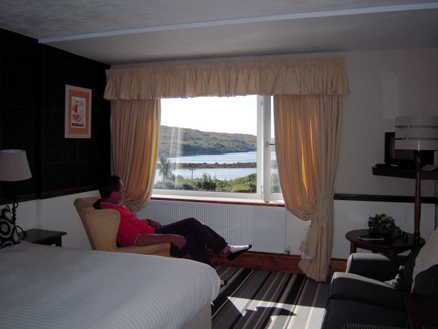 Hinter jeder Kurve lauerten besondere Naturschauspiele und animierten uns immer wieder zum anhalten und staunen. So zog sich die Fahrt nach Clifden ... und dauert wieder gefühlte hundert schöne Stunden ... Das SternchenHotel war wunderschön gelegen. Auch von unserem Zimmer aus war die Aussicht unbeschreiblich, großartig. Der Ohrensessel lockte sofort den Recken, während ich die Schönheiten des Zimmers durchsuchte. Im Restaurant nahmen wir unser Frühstück mit gleicher Aussicht ein, beobachtet wurden wir von den Hummertieren durch die Glasscheibe ...