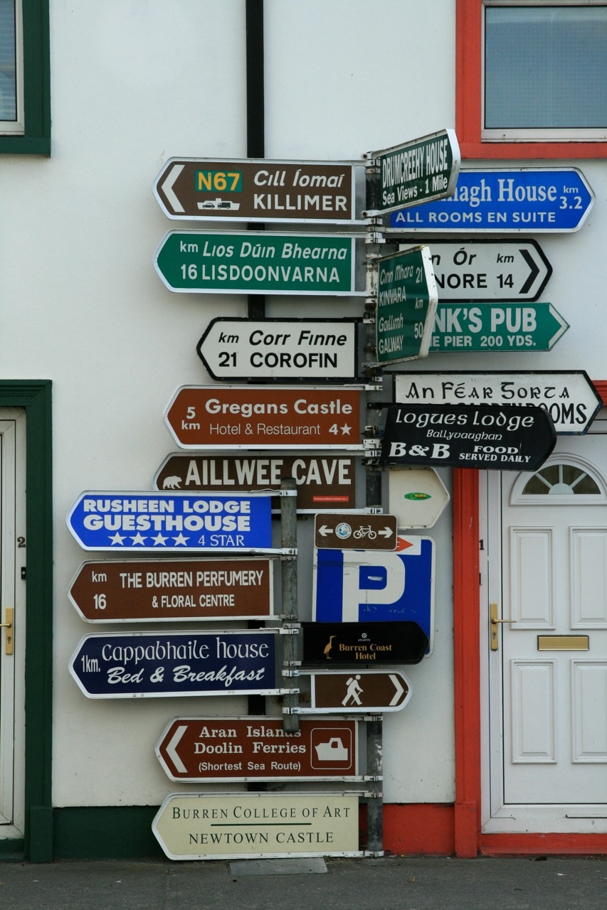 In der Grafschaft Clare sind wir von Ballyvaughan aus durch die irrgartenähnliche steinige Gegend gefahren und konnten neben dem Schauspiel der Wolken, herrliche Landschaften, Dörfer, Ruinen ... Gemäuer entdecken. Ballyvaughan ist ein idyllisches Fischerdorf an der Galway Bay gelegen, mit Reed gedeckten Häusern, appetitlichen Restaurants und Pubs. Hier haben wir unseren Irish Wiskey getrunken. Gegenüber unserem Hotel waren all die Wegweiser, die uns während der gesamten Reise soooo fehlten.