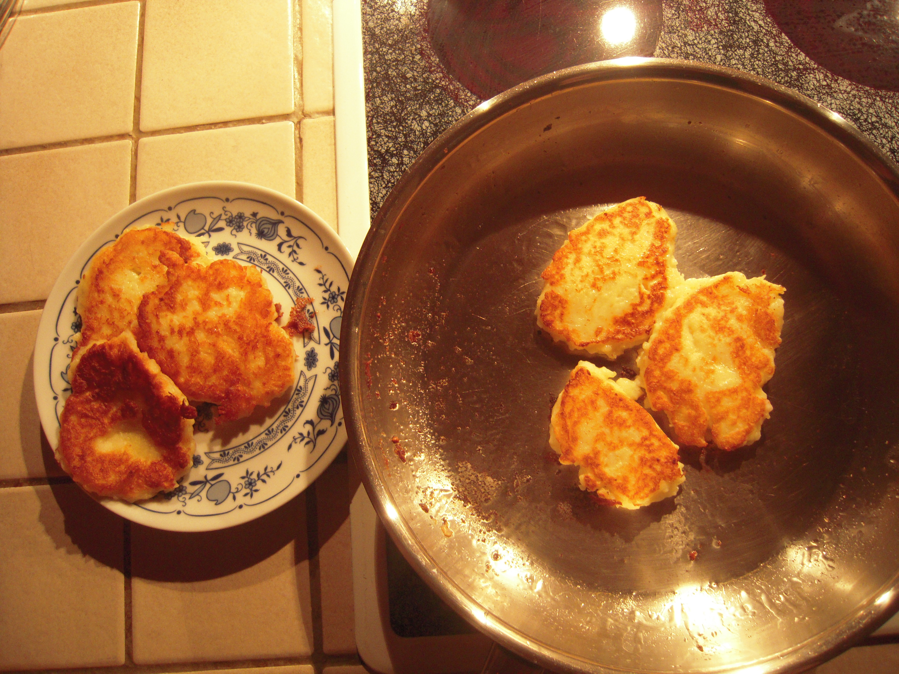 Je nach Laune und Appetit schält Ihr so viel Kartoffeln, wie Ihr mögt, oder bis die Finger dampfen. Immerhin muss noch so viel Energie übrig bleiben, dass die Kartoffeln auch gerieben werden können. Im Handbetrieb ist das mit einem Reibeisen möglich und ihr lasst alles in eine große Schüssel kleckern. Wer Zeit sparen und ohne Haut-Plessuren zu seinem Essen kommen möchte, kann auch eine Küchenmaschine nutzen. Unter diesen Kartoffelschab reibt Ihr eine ganze Zwiebel, rührt ein Ei und eine Prise Salz darunter. Die Flüssigkeit könnt Ihr abschöpfen, indem Ihr einen Löffel auf die Masse legt, da schwimmt der Kartoffelsaft von allein drauf. So, nun Öl in einer Pfanne erhitzen und mit einem Löffel den Schab hineingeben, eventuell breit streichen und goldgelb auf beiden Seiten backen. Mhhhh, guten Appetit!