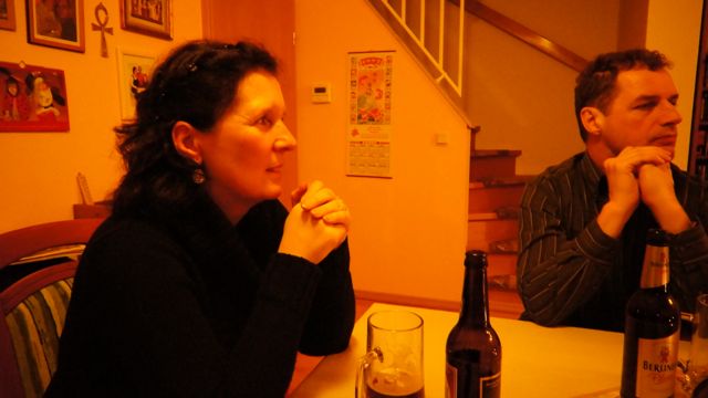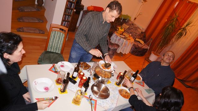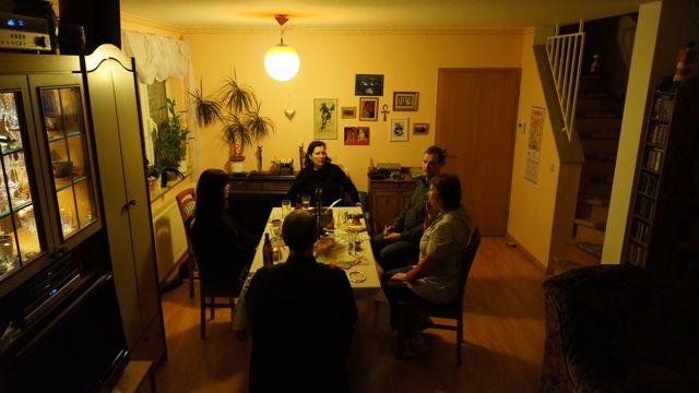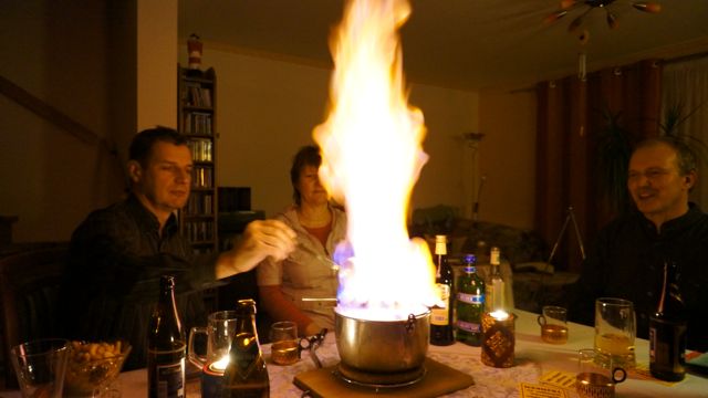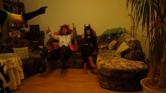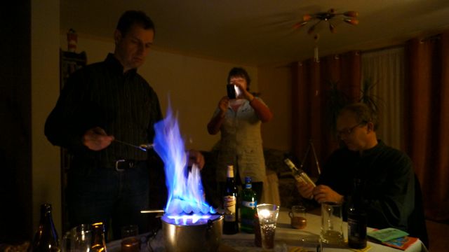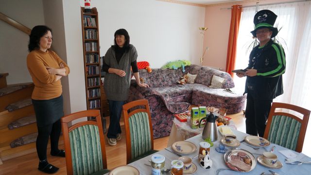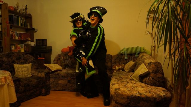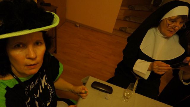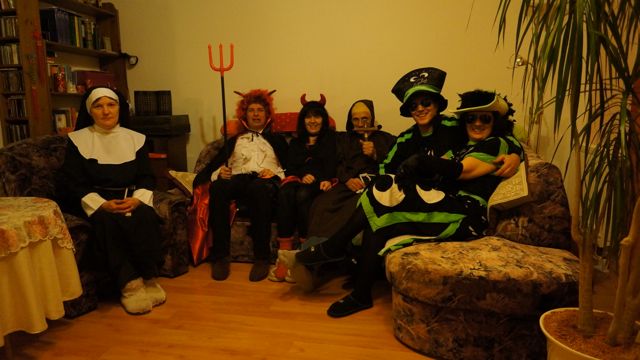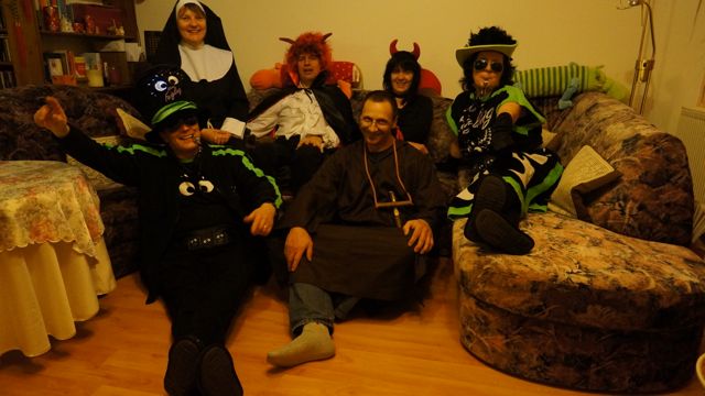 Aber schon ging es los mit dem Vorher-Foto und dem Kostümball. Wir waren teuflisch gekleidet. Nonne und Mönch haben die Feste geweiht. Bewacht von den mutigen kleinen Feiglingen konnten wir uns prächtig amüsieren :-)) Das Nachher-Foto wackelt. ... Danke ihr Hasen!!!!